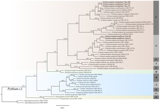 Pythium Pringsheim was established by Pringsheim [], based on P. monospermum Pringsh., and accommodates oomycetes that produce hyaline and coenocytic hyphae, without septa and zoospores, which are developed in a vesicle that forms at the tip of a discharge tube derived from a sporangium []. To date, there are more than 160 species in the genus Pythium sensu lato (s.l.), which include plant pathogens found worldwide [,,,]. Some Pythium species are important pathogens of animals, and others can be beneficial as biological control agents that protect against pathogenic fungi [,]. According to Lévesque and de Cock [], Pythium s.l. could be split into eleven clades (A–K) based on the phylogenetic analysis. After several rearrangement, Pythium s.l. were divided into five genera including Pythium sensu stricto (s.s.) (clades A–D); Elongisporangium by Uzuhashi, Tojo and Kakish (clade H); Globisporangium by Uzuhashi, Tojo and Kakish (clades E–G, I, and J); Pilasporangium Uzuhashi by Tojo and Kakish (distinct from the 11 lettered clades); and Phytopythium by Abad, De Cock, Bala, Robideau, A.M. Lodhi, and Lévesque (clade K) [].