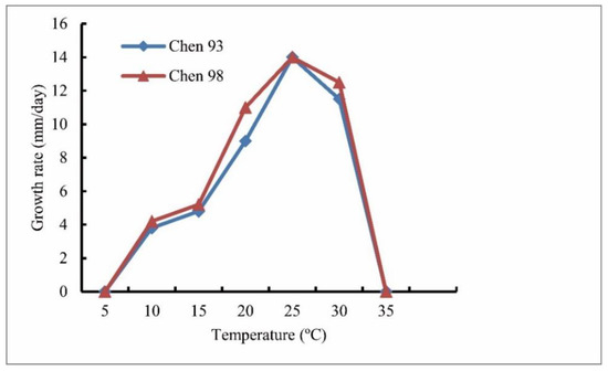 Mycelial growth rate of Globisporangium pengfuense isolates Chen 93 and 98 on potato carrot agar at different temperatures.