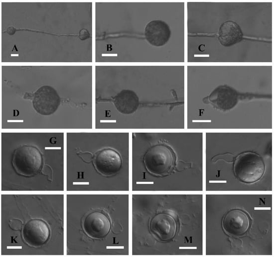 Asexual and sexual reproductive bodies of Globisporangium pengfuense (holotype, Chen 93). (A) Catenulate sporangia. (B) Globose and terminal sporangium. (C–E) Intercalary sporangia. (F) Sporangium with apical papillae. (G) Diclinous antheridium and plerotic oospore. (H,I) Fist-shaped antheridial cells. (J) Crook-necked antheridial cell. (K) Monoclinous antheridium. (L) Intercalary oogonium. (M) Nearly plerotic oospore and two antheridia. (N) Plerotic oospore and three antheridia. Scale Bars (A–N) = 10 μm.