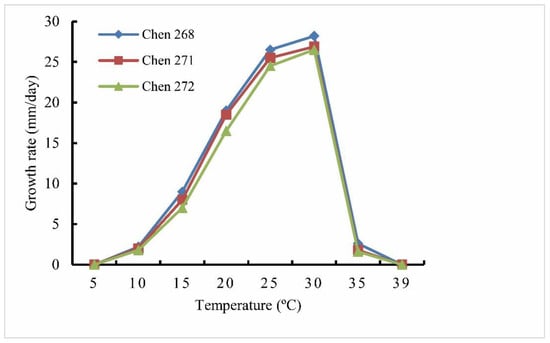 Mycelial growth rate of Globisporangium tenuihyphum isolates Chen 268, 271, and 272 on potato carrot agar at different temperatures.