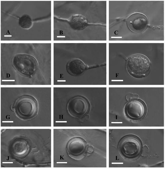Phylogenetically, Globisporangium tenuihyphum belongs to clade J of Pythium s.l. in the phylogenetic tree. Globisporangium acanthophoron and G. baisense resemble G. tenuihyphum, and the combined ITS and cox1 sequences also suggest a close relationship between these two species and G. tenuihyphum (Figure 1). However, G. acanthophoron has ornamented oogonia and a thinner-walled oospore wall (up to 1.5 µm) [], while G. baisense is distinguished from G. tenuihyphum by producing variously sac-like oogonia and the presence of diclinous sessile antheridia and double oospores (Table 3) [].