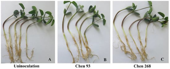 Pathogenicity was confirmed using 3-day-old V8A plugs (1.5 cm diam) of the isolates Chen 93 and Chen 268 using the hypocotyl slit inoculation method [] on the soybean cultivar Hefeng 47, which is commonly grown in Huang-Huai Valley. Five soybean seedlings inoculated with uncolonized agar plugs served as the controls. Five soybean seedlings were inoculated for each isolate and incubated at 25 °C with a 12 h photoperiod in a greenhouse for 4–5 d. The experiments were repeated three times.