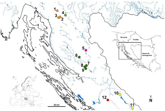 A map of the investigated area, with marked distribution ranges of the investigated Telestes species and sampling localities: (1) Jasenak field, (2) Studenac, (3) Sušik, (4) Šmit Lake, (5) Krbavsko field, (6) Jadova, (7) Suvaja, (8) Ričica, (9) Obsenica, (10) Vinalić, (11) Cetina, and (12) Čikola.