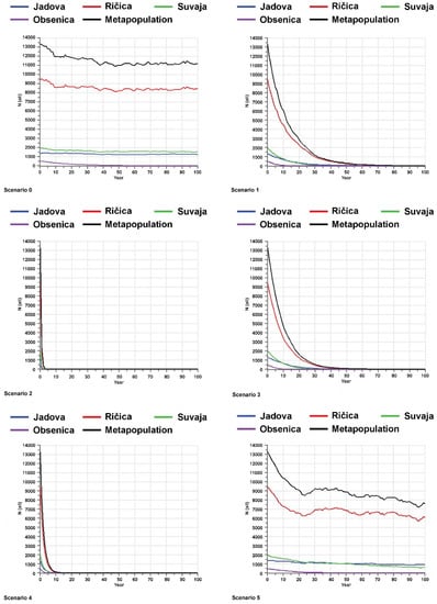 Scenario 4 encompasses simultaneous effects of the deterioration of the water quality, invasive species, and temperature increase due to climate change. Unfortunately, the simultaneous action of various threats has been widely observed, leading to the extinction vortex of populations, so this scenario is also realistic and possible. The negative effects of all three threats acting at the same time include a skewed sex ratio (70% of males by birth), reduced reproductive rates (by 20%) due to the deterioration of habitat conditions, and increased mortality rates (by 15% in the youngest age classes and 7% in 2+ and further classes) as a consequence of the effects of both invasive species and suboptimal habitat conditions.