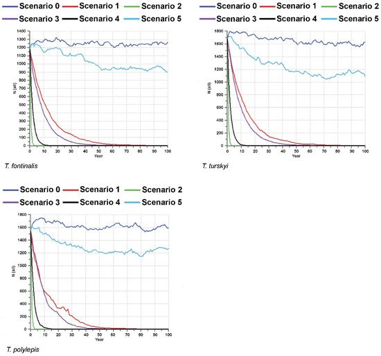 Results of population viability analyses for T. fontinalis, T. turskyi and T. polylepis based on six scenarios.