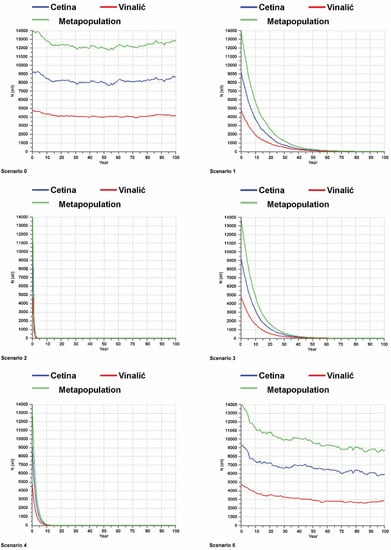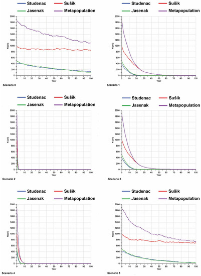 Interesting and important results were yielded by PVA analyses conducted on the endemic Telestes species and based on a total of six different scenarios (Scenario 0 encompassing the current situation, without additional threats, and Scenarios 1–5 modelling the viability of the investigated Telestes populations and species in cases of possible future threats and catastrophes) (Figure 2, Figure 3, Figure 4 and Figure 5). The viability of all populations and species is predicted under the current conditions (the probability of extinction in the next 100 years being 0). Moreover, Scenario 0 anticipates the stability of the majority of populations. Exceptions include T. karsticus populations from the Studenac stream and Jasenak field for which a reduction in the effective population sizes is anticipated. Consequently, it is likely that the effective population size of T. karsticus as a species will be reduced in the next 100 years if the current conditions remain. All four scenarios that comprise threats on habitats of the investigating species occurring and/or being more severe and intense (Scenarios 1–4) yielded a strong prediction of all populations experiencing extinction within the next 100 years. Scenarios 2 and 4 seem to be particularly problematic, which predict the very soon extinction of all endemic Telestes species (within the next 15 years). Scenario 5, encompassing catastrophic events of strong negative effects on populations, is not likely to provoke their extinction, although fluctuations and reductions in the effective population sizes will probably occur under such conditions.