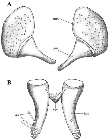 Figure 2. Lepiseodina latipennis (Sarà 1953), male genitalia adapted from the original description by Sarà (1953). (A). Gonocoxites and gonostyli. (B). Hypopods and hypoproct. Abbreviations: gnx = gonocoxite, gns = gonostyli, hpd = hypopod, epi = epiproct, ten = tenacula. No scale available based on original drawing.