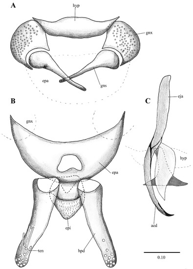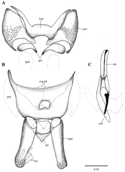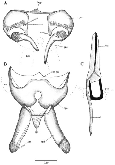 Figure 3. Lepiseodina rothschildi (Eaton, 1912), male genitalia. (A). Hypandrium, gonocoxites and gonostylus. (B) Epandrium, hypopods, tenacula, hypoproct. (C) Aedeagus. Abbreviations: aed = aedeagus, con plt = condyle plate-like, eja = ejaculatory apodeme, epi = epiproct, gnx = gonocoxite gns = gonostylus, ten = tenacula, hyp = hypandrium. Scale (A–C) in millimeters (mm).