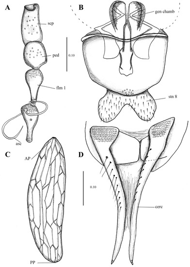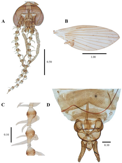 Figure 4. Lepiseodina latipennis (Sarà, 1953), male. (A) Head. (B) Wing. (C) Flagellomeres and ascoids. (D) Genitalia. Scale (A–D) in millimeters (mm).