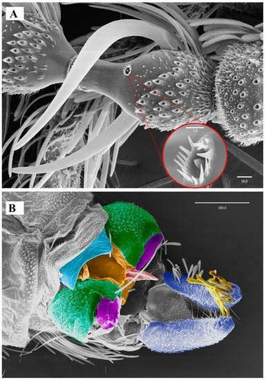 Figure 6. Lepiseodina latipennis (Sarà, 1953), male. SEM pictures. (A) First flagellomere (3rd antennal segment), red circle higher magnification of sensilla. (B) Genitalia, light blue = hypandrium, orange = aedeagal sheath, green = gonocoxites, purple = gonostyli, red = aedeagus, dark blue = hypopods, yellow = tenacula. Scale (A,B) in micrometers (μm).