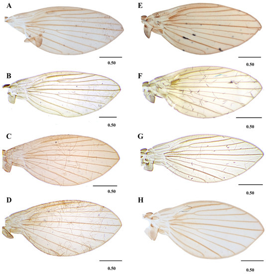 Figure 8. Wings variability of: (A–D) Lepiseodina latipennis (Sarà 1953). (E,F) L. tristis (Meigen, 1830), (G,H) L. rothschildi (Eaton, 1912). Scale (A–H) in millimeters (mm).