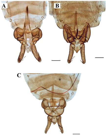 Figure 9. Genitalia of: (A) Lepiseodina tristis (Meigen, 1830), (B) Lepiseodina rothschildi (Eaton, 1912), (C) Lepiseodina latipennis (Sarà, 1953). Scale (A–C) in millimeters (mm), scale lines = 0.10 mm.