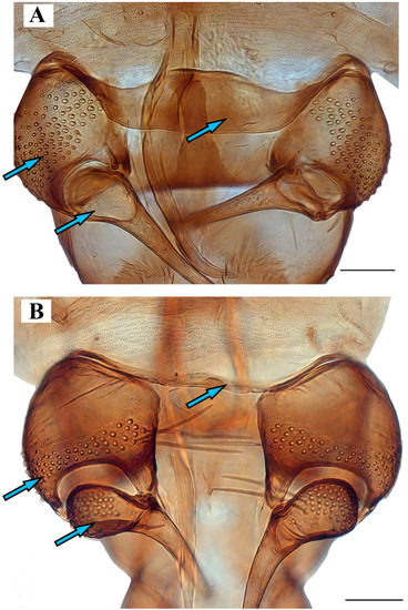 Figure 10. Genitalia of: (A) Lepiseodina latipennis (Sarà, 1953), (B) Lepiseodina tristis (Meigen, 1830). Blue arrows show differences in hypandrium, gonocoxite, and gonostyli. Scale (A,B) in millimeters (mm), scale lines = 0.10 mm.