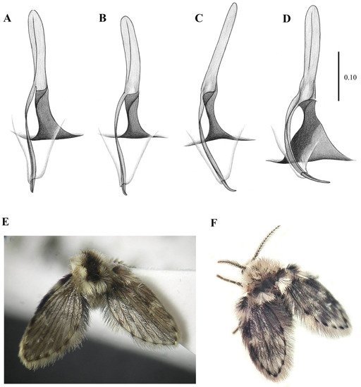 - Wagner, R. Family Psychodidae, 11–65. In Psychodidae–Chironomidae; Catalogue of Palaearctic Diptera; Soós, A., Ed.; Akadémiai Kiadó: Budapest, Hungary, 1990; Volume 2, 499p. [Google Scholar]