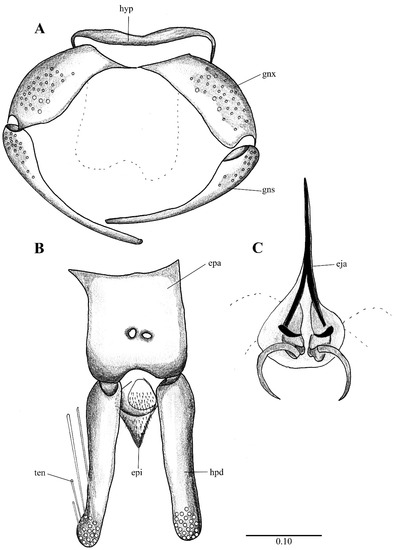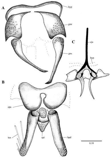 Figure 12. Telmatoscopus advena (Eaton, 1893), male genitalia. (A) Hypandrium, gonocoxites and gonostylus. (B) Epandrium, hypopods, tenacula, hypoproct. (C) Aedeagus. Abbreviations: epa = epandrium, epi = epiproct, eja = ejaculatory apodeme, gnx = gonocoxite gns = gonostylus, hpd = hypopod, ten = tenacula, hyp = hypandrium. Scale (A–C) in millimeters (mm).