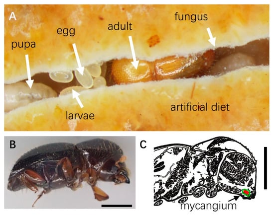 Typical reproduction of an ambrosia beetle, Euwallacea interjectus, on a semi-artificial diet. (A) Progeny (egg, larva, pupa, and new adult) in a gallery that the dispersed female adult (their mother) oviposited after the establishment of ambrosia fungi in the diet. (B) Female adult of E. interjectus in lateral views which emerged on the diet. (C) Micro-CT scanning cross-section of oral mycangium (colored in green) in the female adult by Jiang et al. [33] (unpublished image): in its dispersal period, the mycangium has filled with compacted fungal inoculum (colored in red), which is used to propagate a fungal garden in newly-bored galleries. Scale = 1 mm.