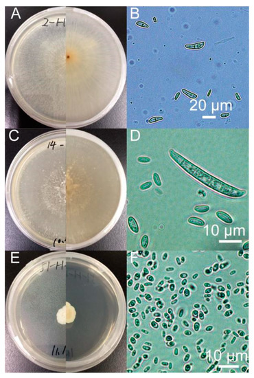 Morphological characteristics of Fusarium sp., Neocosmospora metavorans, and Meyerozyma guilliermondii. (A,B): colony and conidial spores of Fusarium sp., respectively, on PDA (25 °C, dark, 12 days); (C,D): colony and conidial spores of N. metavorans, respectively, on PDA (25 °C, dark, 14 days); (E,F): colony and conidial spores of M. guilliermondii, respectively, on PDA (25 °C, dark, 9 days).