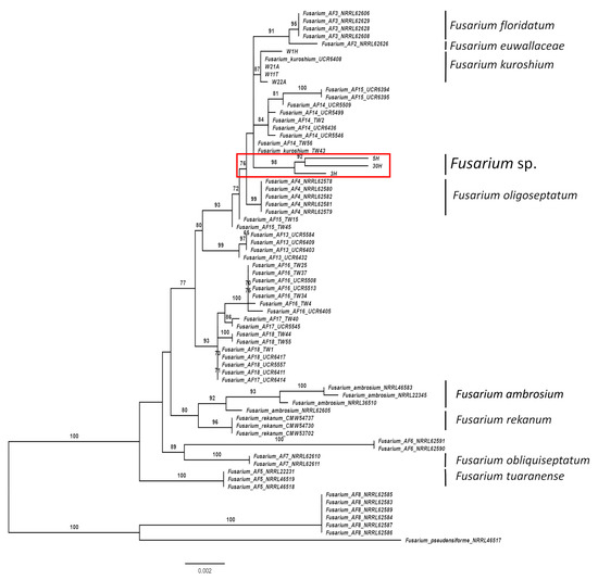 For the in-depth identification of ambrosia Fusarium, phylogenetic analysis was performed. Sequence datasets for use in the alignment were produced using the obtained sequences and that of related species present in the NCBI database (accession numbers are included in Supplementary Table S1). The sequences were aligned using the MUSCLE algorithm [40] and adjusted manually. The maximum-likelihood tree prepared using an ultrafast bootstrap of 1000 replicates [41] was inferred using the IQ-TREE program [42] with the Model Finder option [43].