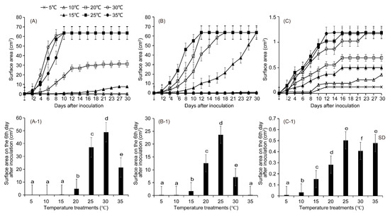 Growth of mycelial cultures of (A) Neocosmospora metavorans, (B) Fusarium sp., and (C) Meyerozyma guilliermondii on the PDA at different temperature treatments (5, 10, 15, 20, 25, 30, and 35 °C). (A-1,B-1,C-1) are the fungal colony’s surface area of N. metavorans, Fusarium sp., and M. guilliermondii on the 6th day after inoculation in each temperature treatment, respectively. The overall difference in medians among the temperature treatments (the 6th day after inoculation) is significant at p < 0.001 using Kruskal–Wallis test. Means with different letters (a, b, c, d, e, and f) are significantly different among temperatures at the 1% level. SD, standard deviation. N = 5 replicates per fungal species.
