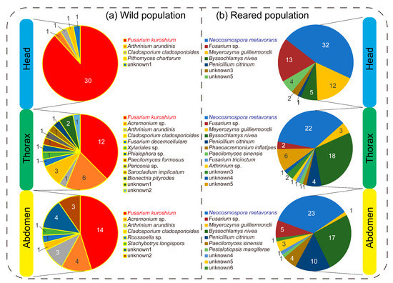 Comparison of fungal flora and their relative dominance in female adults of Euwallacea interjectus among wild ((a): 51 beetles) [34] and reared ((b): 54 beetles) populations (Table 1). Numbers of beetles from which each fungal species was isolated is shown in pie charts.