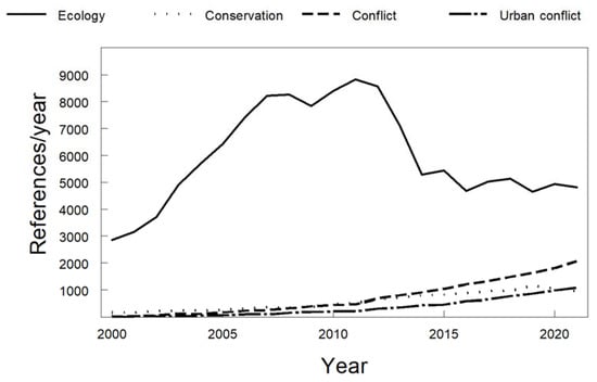 Perry et al. [] showed a decadal increase in publications related to urban ecology. Here we look at annual patterns in the years since the turn of the century. A total of 167,744 papers were published in the four categories surveyed over this period, 78.3% of them in the “urban ecology” category, 9.4% in “human-wildlife conflict”, 7.6% in “urban conservation,” which included a substantial number of papers focusing on cultural heritage preservation, and 4.7% in “urban +“human–wildlife conflict””. Consistent with the findings of Perry et al. [] and Collins et al. [], all four categories showed an increase in the number of annual publications during the first decade surveyed, numbers decreased thereafter, then stabilized in the “urban ecology” category and continued increasing in all others (Figure 1).