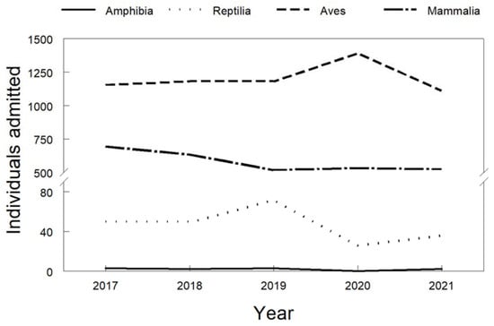 Five-year trends in admittance of amphibians, reptiles, birds, and mammals at the South Plains Wildlife Rehabilitation Center in Lubbock, Texas.