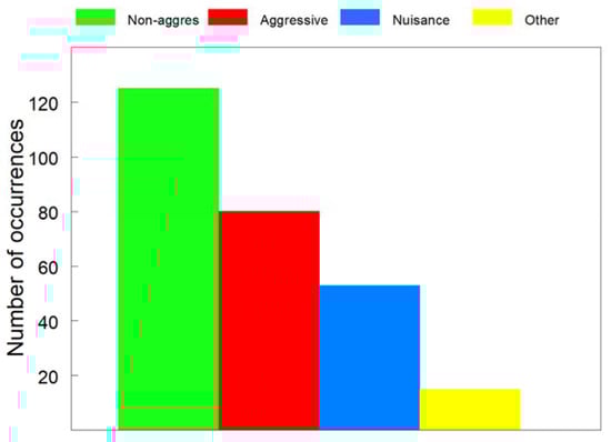We conducted a non-exhaustive analysis of 200 news stories from late 2020 to early 2022. Stories came from the US and across the world and were extracted from specific news media (e.g., New York Times, BBC News, Haaretz), news aggregators (e.g., Yahoo), and repeated searches of the News feature in Google, Stories (Supplementary Material) were examined to make sure they met the criterion of reporting about wildlife in an urban setting but were not otherwise selected for content. Our findings (Figure 3) show some concerning trends but also some good news. Often, the media will focus on wildlife attacks or incidents. When that happens, most of the time, animals are vilified, and words like “terrorizing”, “violent”, “aggressive”, and “angry” are used. Even in stories not focused on the animal’s aggressiveness, there is still negativity—they may be “trashing the city” or “annoying residents”, for example. In these stories, residents will be quoted explaining how hard it is to cope with the animals or how scared or annoyed they are. Often, the species in these stories are perceived as unpleasant—reptiles, predators, and so on. However, these “aggressive” depictions (Figure 3, green) are not as common as ones where animals are portrayed as non-aggressive (Figure 3, red). In the remainder of the stories (Figure 3, blue), animals are also portrayed negatively, but this time as nuisances rather than threats. It is important to note that the aggressive type events are usually covered by multiple media outlets, often in multiple news stories. As we did not exhaustively include all stories on the same topic here, it is possible that the aggressive stories numerically dominate. Either way, no matter the category, the negative frames clearly dominate news stories.