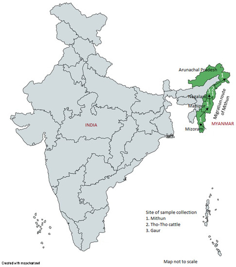 A total of 163 random blood samples from genetically unrelated four mithun populations, corresponding to four North-Eastern Indian states (Figure 1), namely, Arunachal Pradesh (n = 40), Nagaland (n = 41), Manipur (n = 16), and Mizoram (n = 66); additionally, 10 blood samples from Indian bison/wild gaur (Bos gaurus) from Mysore Zoo, Karnataka State, India were collected for diversity analysis. Twenty-five samples of a local cattle breed, Tho-tho, were also collected for positive control and comparative purpose. Genomic DNA from each sample was isolated from white blood cells by using a Promega DNA isolation kit (Promega, Madison, WI, USA) [41] and stored at −20 °C until further use.