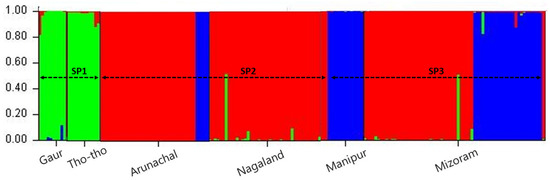 Model-based grouping utilizing the STRUCTURE analysis clustered all the bovine populations into three subgroups (SP1, SP2, and SP3). SP1 = Gaur and Tho-tho samples; SP2 = Arunchal and Nagaland mithun samples; SP3 = Manipur and Mizoram mithun samples given different color codes, assuming K = 3.