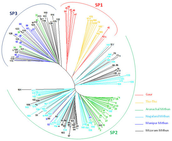 Based on STRUCTURE analysis, the subpopulation SP1 comprised Tho-tho cattle and gaur. Subpopulation SP2 consists of mithun population from Arunachal Pradesh and Nagaland, while subpopulation SP3 consists of mithun population from Manipur and Mizoram. The distinct subpopulations were obtained as per geographical locations and species.