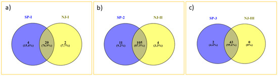 Venn diagrams depicting comparison of grouping patterns generated by STRUCTURE and neighbor-joining tree. SP1 = Gaur and Tho-tho samples; SP2 = Arunachal and Nagaland mithun samples; SP3 = Manipur and Mizoram mithun samples. (a) Venn diagram showing co-linearity between model-based sub-population SP1 & neighbor-joining based cluster 1. (b) Venn diagram showing co-linearity between model-based subpopulation SP2 & neighbor-joining based cluster 2. (c) Venn diagram showing co-linearity between model-based subpopulation SP3 & neighbor-joining based cluster 3.