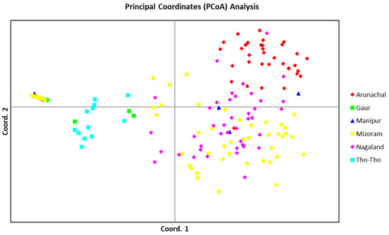 The PCoA, using allelic data of 19 SSR markers, determined the patterns of variation among the three bovine populations (Mithun, Gaur, and Tho-Tho). The PCoA analysis also clearly separated the STRUCTURE subpopulations (Figure 5). Gaur and Tho-tho cattle grouped close to each other in the same group-I, similar to model-based subpopulation 1. However, gaur and Tho-tho have distinct subgroups within group-I. This result is similar to the neighbor-joining clustering pattern and further supported the results of the neighbor-joining clustering, and indicated that gaur and Tho-tho are different from each other. The PCoA results for Nagaland and Arunachal mithun, along with a few Mizoram mithun grouped in top right-side group-II, are similar to the model-based STRUCTURE analysis. Similarly, Manipur and Mizoram mithun grouped in the top left-side of group-III, similar to the model-based SP3 subpopulation grouping.
