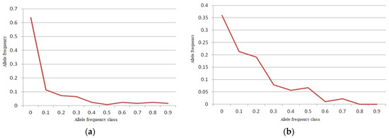 A normal L-shaped distribution of allelic frequencies was found in the bottleneck analysis in the Indian mithun population by the qualitative graphical test (Figure 6a). There was no mode-shift found in the distribution of allelic frequencies, showing the absence of any genetic bottleneck in the Indian mithun population, similar to Yunnan mithun [54]. However, the gaur population was found to have shifted mode, indicating the presence of a bottleneck in recent history, as the distribution of allelic frequency did not form an exact L-shaped distribution (Figure 6b).