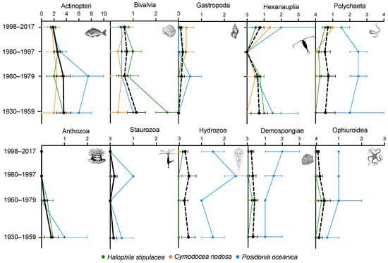 Temporal changes in richness (mean ± SE) in 10 metazoan classes within seagrass sediments (H. stipulacea in green; C. nodosa in orange; P. oceanica in blue; overall of the three seagrass species in black) from the eastern Mediterranean Sea (Greece and Cyprus). Solid dark lines indicate significant differences between time intervals and dashed dark lines indicate non-significant differences (p < 0.002 after Bonferroni correction), considering the three seagrass species combined.