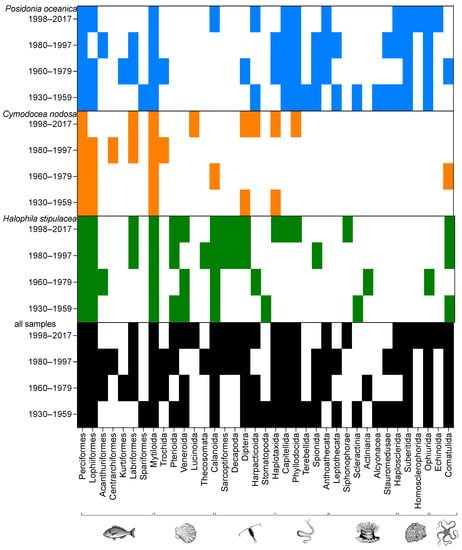 Heat map displaying the presence of metazoan orders through 4 different time periods within seagrass sediments (all samples in black; H. stipulacea in green; C. nodosa in orange; P. oceanica in blue) from the eastern Mediterranean Sea (Greece and Cyprus).