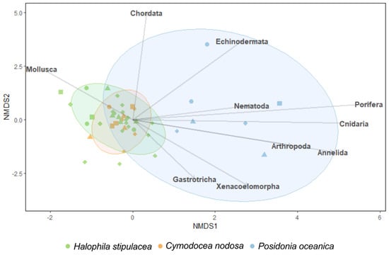 Nonmetric multidimensional scaling plot of temporal changes in metazoan communities within seagrass meadows (H. stipulacea in green; C. nodosa in orange; and P. oceanica in blue). Ellipses show 95% standard error around the mean the three seagrasses and dark grey arrows indicate significant relationship (p < 0.05) between the NMDS axes and different metazoan phyla. Greater length of arrows indicates greater r2 value and is relative to the importance of the explanatory variable in the ordination, and the arrow direction indicates positive or negative correlations. Kruskal stress = 0.16.
