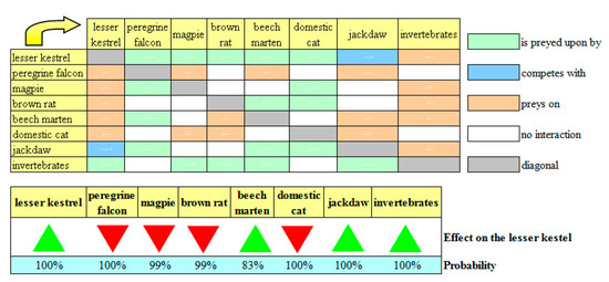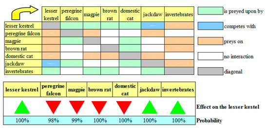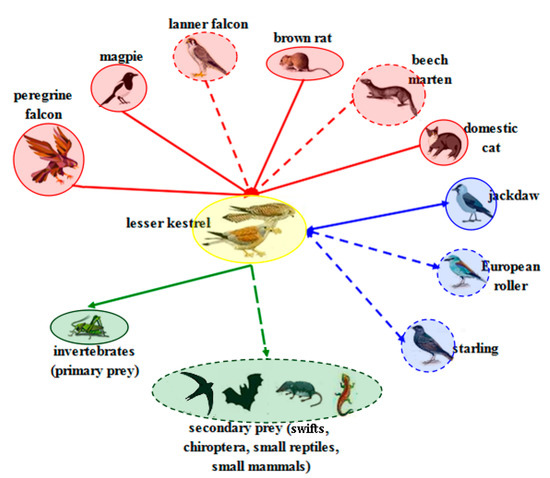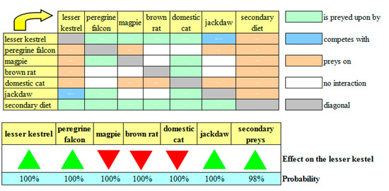 Firstly, based on our 10 years of field experience in the study area [9,10], we detected all of the species and/or taxonomic groups (players henceforth) that directly interact with the lesser kestrel. We detected six predators (the beech marten, the brown rat, the domestic cat, the magpie, the lanner falcon, and the peregrine falcon), three competitors (the European roller, the jackdaw, and the starling) and two kinds of prey (primary and secondary). Invertebrates (in particular, grasshoppers) are the primary prey of the lesser kestrel. In the absence or shortage of invertebrates, lesser kestrels feed on swifts, chiroptera, small reptiles, and small mammals (secondary prey).
