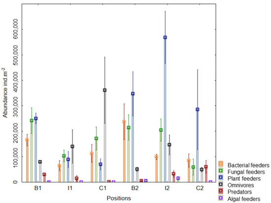 Abundance (ind.m−2) of trophic groups in the nematode communities. B—Transported blocks; I—samples in between the blocks; C—control samples. Number 1 is for initial phase; 2 is for late phase. Points are means; whiskers are standard error.