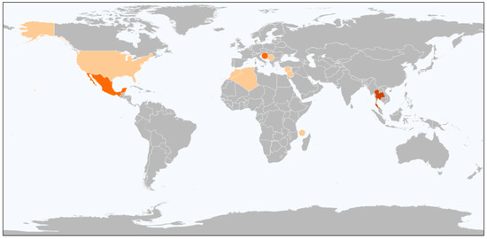 Distribution of contributions to the Special Issue. Colored countries are represented in the Special Issue; color shade represents the number of contributions from a country (light—1, dark—3).