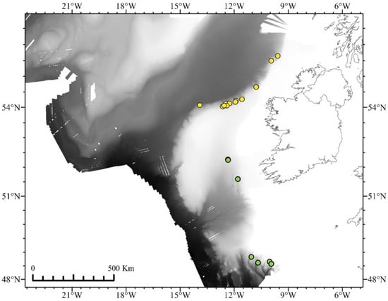 Locations of ROV dives that collected octocorals from 2017 (green circles) and 2018 (yellow circles). Bathymetry from INFOMAR and Ross et al. [38]. Visualized in ArcGIS Pro [39].