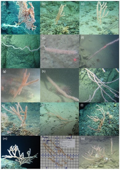 In situ photographs taken by ROV Holland I representing the gross morphology of (a) Haplotype 13 (M16), (b) Haplotype 13 (M17), (c) Haplotype 13 (M18), (d) Haplotype 14 (M17), (e) Haplotype 15 (M19), (f) Haplotype 16 (M28), (g) Haplotype 16 (M29), (h) Haplotype 17 (M30), (i) Haplotype 18 (M20), (j) Haplotype 19 (M21), (k) Haplotype 19 (M22), (l) Haplotype 20 (M23), (m) Haplotype 21 Acanella arbuscula (M24), (n) Haplotype 21 A. arbuscula (M25), and (o) Haplotype 21 A. arbuscula (M26).