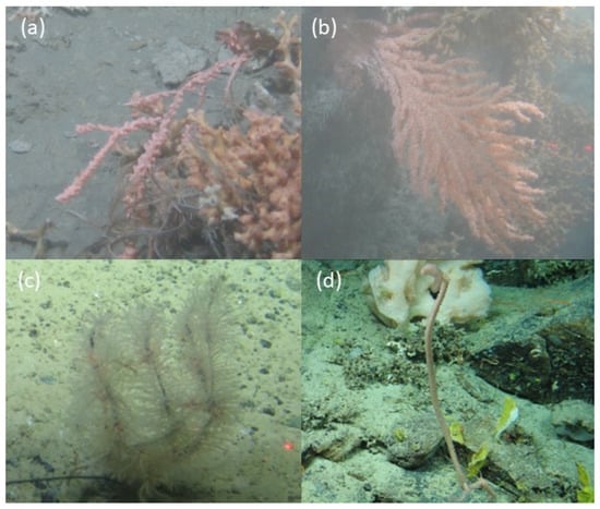 In situ photographs taken by ROV Holland I representing the gross morphology of (a) Haplotype 35 Primnoa sp. (M31), (b) Haplotype 36 Primnoa sp. (M31), (c) Haplotype 37 Thouarella grasshoffi (M35), and (d) Haplotype 38 Calyptrophora clinata (M36).