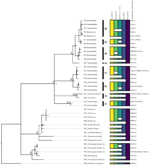 Maximum likelihood tree of all recovered haplotypes (H) and corresponding morphotypes (M) from the 3390 base pair alignment and the corresponding species delimitation results from GMYC and mPTP methods (ST = single threshold and MT = multiple threshold). Each box within each column refers to a unique species recovered by that method. 1. Family Keratoisididae. A1, B1, C1, D1, D2, F1, I1, and J3 refer to the keratoisidid subclades defined by Watling et al. [16], 2. Family Primnoidae, and 3. Family Chrysogorgiidae. * represent bootstrap values 90–99. ● represents bootstrap values between 71–89. Nodes with support lower than 70 have been collapsed and bootstrap values not displayed.