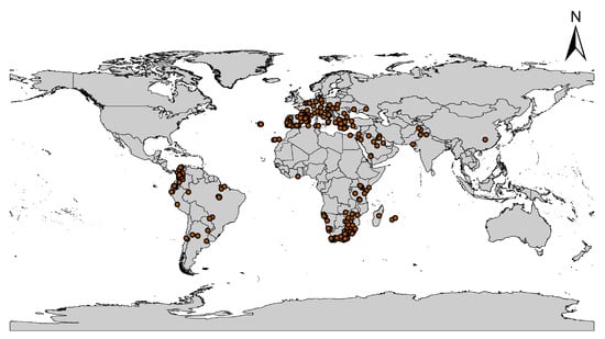 Global C. albiceps occurrence records were collected from different digital databases including the Global Biological Information Facility (GBIF.org: https://doi.org/10.15468/dl.hbhmdq (accessed on 3 January 2022)), Project NOAH (Projectnoah.org (18 December 2021)), and I Naturalist (inaturalist.org (10 January 2022)). The occurrence data were about 3500 georeferenced points (Table S1). The data were subjected to three major filtration steps, which included removing duplicated data, cleaning records without latitudes and longitudes, and finally, spatial rarefication of points by distances [23,24]. The remaining records with 2177 points were converted to comma-delimited (CSV) files and utilized to predict the current and future global distribution of C. albiceps (Figure 1).