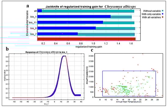 (a) The jackknife test of the most important variables, (b) Response curve of the most effective bioclimatic factor (bio 1) in C. albiceps distribution, and (c) Two-dimensional niche of C. albiceps between annual temperature (bio 1) represented by red dots and annual precipitation (bio 12) represented by green dots.