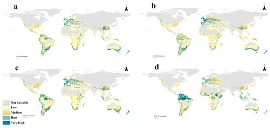 Maxent models of predicted global future distribution of C. albiceps under two RCPs: (a) 2050 for RCP 2.6; (b) 2050 for RCP 8.5; (c) 2070 for RCP 2.6, and (d) 2070 for RCP 8.5.