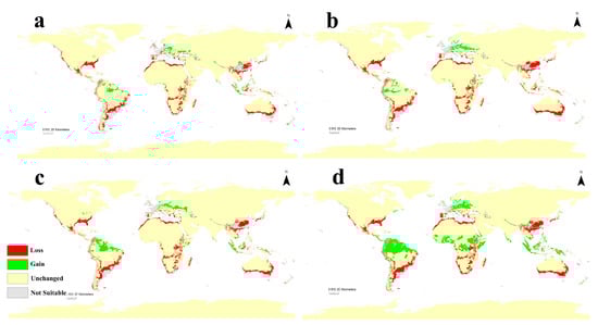 Calibration maps showing gain and loss in habitat suitability of C. albiceps through the four future scenarios against the current status with threshold (>0.5): (a) 2050 for RCP 2.6; (b) 2050 for RCP 8.5; (c) 2070 for RCP 2.6, and (d) 2070 for RCP 8.5.