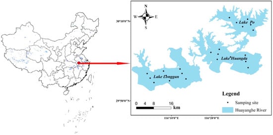 The Huayanghe Lakes (116°00″ E–116°33″ E, 29°52″ N–30°58″ N), which consist of four lakes, namely, Lake Longgan, Lake Daguan, Lake Huang, and Lake Po, are located in the north of the middle reaches of the Yangtze River in Anhui Province, China (Huangda Lake is composed of Lake Daguan and Lake Huang). The lake district has a subtropical climate with four distinct seasons, rain fall mostly occurs in the summer [7]. The total area of the Huayanghe Lakes is about 966 km2 when the maximum depth of lakes is 17 m. Sampling points are shown in Figure 1.