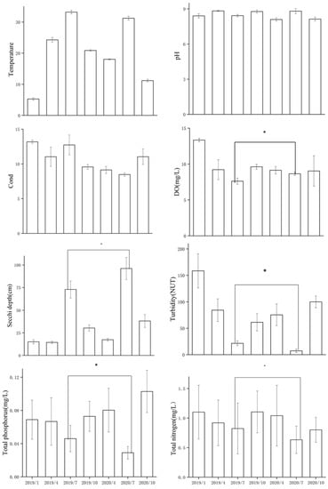 The samples were collected from 26 sampling sites from January 2019 to October 2020. From June 2020, the water depth of the lake increased with the increase of rainfall, exceeding 11.88 m. Then, the flooding began. The water-level in HYH is between 9 and 17 m, with similar seasonal characteristics, the highest in the summer and the lowest in the winter (Figure 2). Floods occurred in the summer of 2020, and the water depth increased by 1.85 m compared with other years. SD and WD increased significantly during the flood period (by 22.8% and 38.9%, respectively). SD and WT, as well as WD, had an increasing and then a decreasing trend. The total nitrogen concentration decreased from 0.98 to 0.7 mg/L, and the total phosphorus concentration decreased from 0.04 to 0.031 g/L. The concentrations of TN, TP, and turbidity were notably (p < 0.05) lower in the flood period than in the regular hydrological cycle (Figure 3). Flooding occurs mainly in the summer, so this part focuses on comparing the differences between the summers in different years.