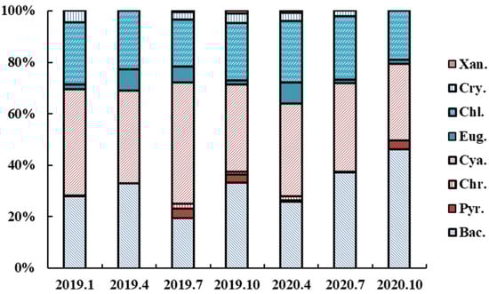 Changes in relative densities of different phytoplankton taxa during sampling periods. Abbreviations was used in the diagram: Bac: bacillariophyta, Cry: cryptophyta, Pyr: pyrrophyta, Cya: cyanobacteria, Chr: chrysophyta, Chl: chlorophyta, Eug: euglenophyta, and Xan: xanthophyta.